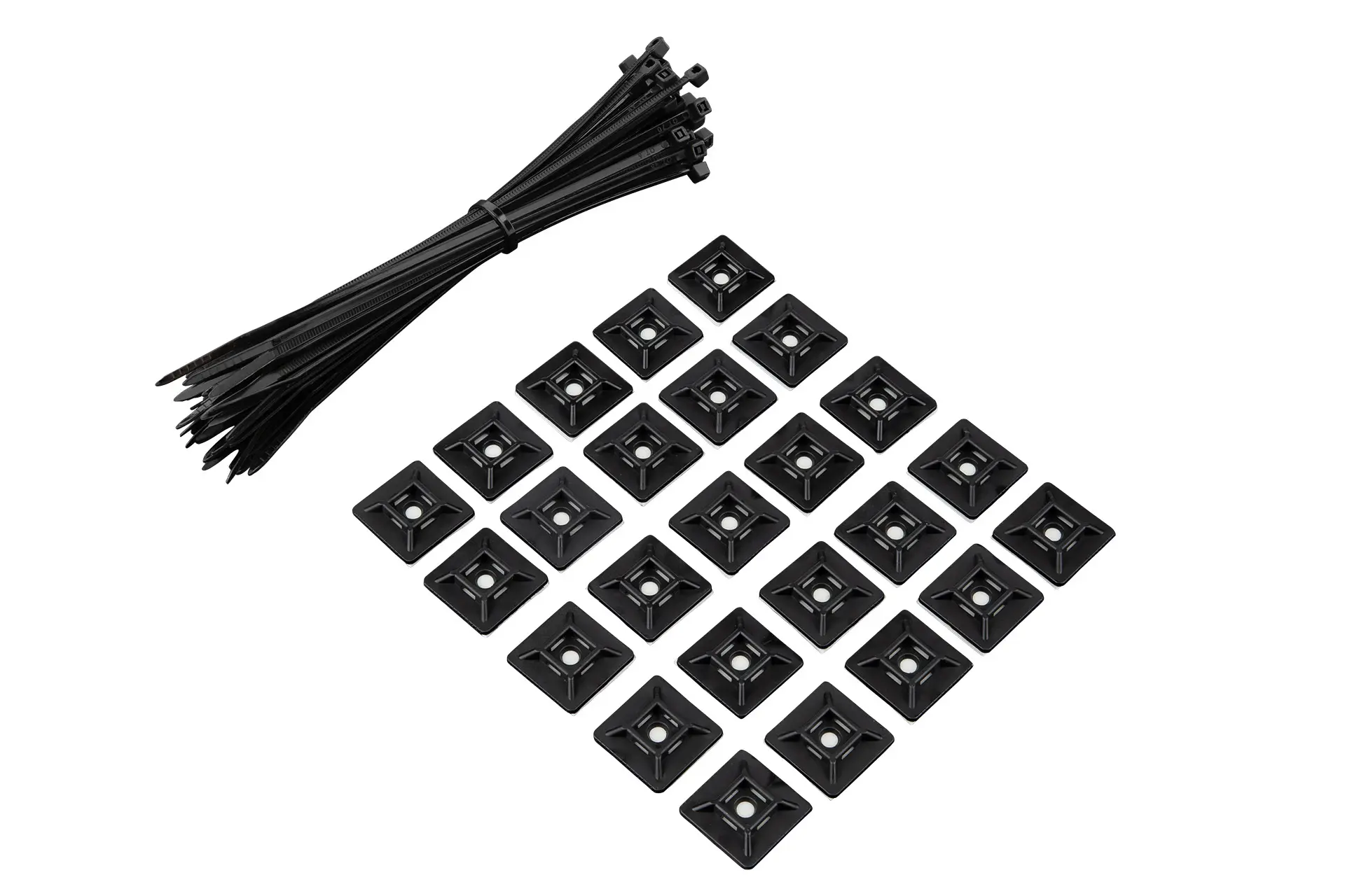 The set consists of 50 cable ties and 25 matching adhesive holders with 3M™ adhesive pads for secure attachment of the cable ties.