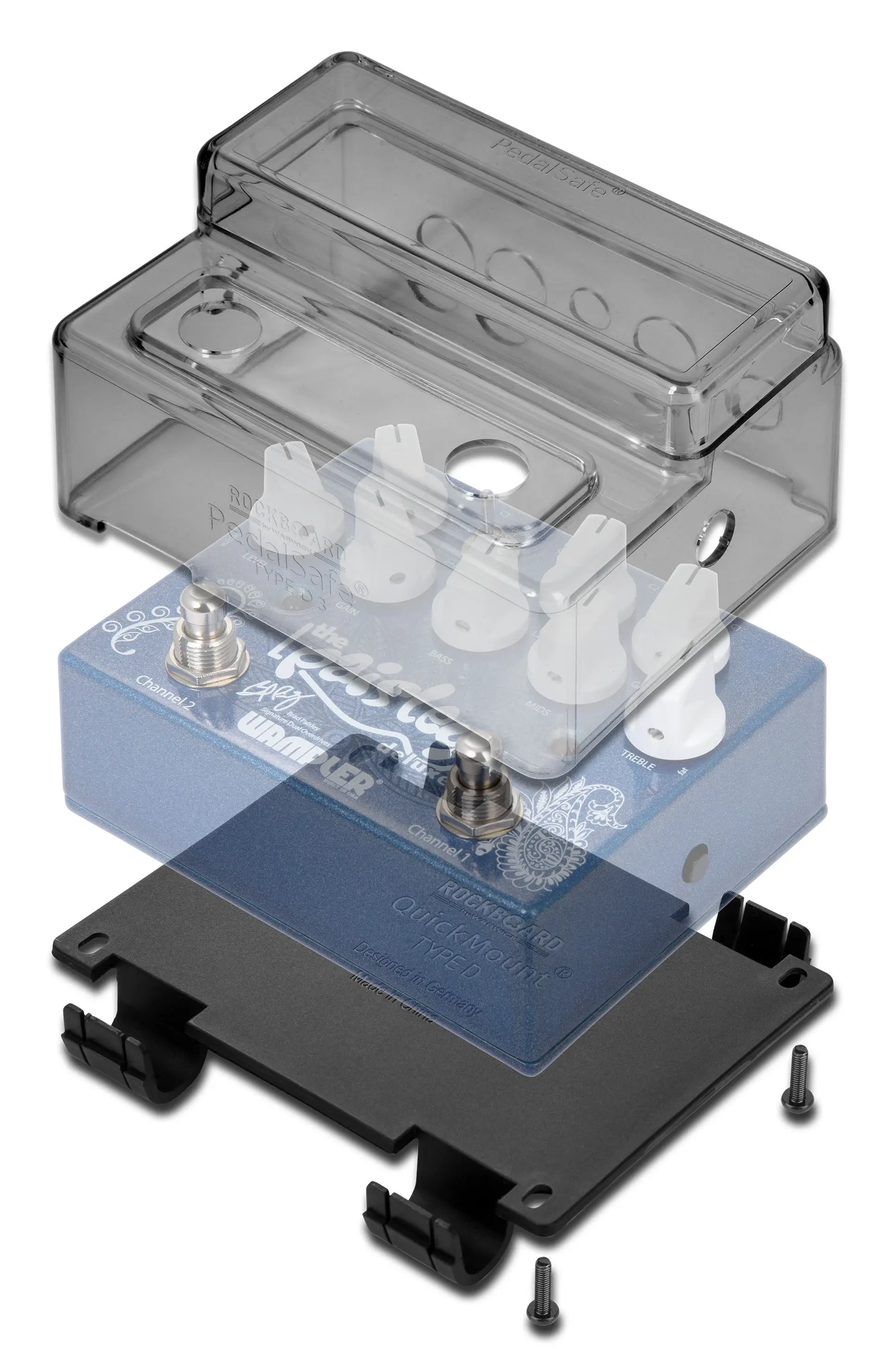 The RockBoard PedalSafe system was designed to keep your pedals safe, secure and in pristine condition. The flexible PedalSafe Type D3 Protective Cover and the QuickMount Pedal Mounting Plate fit for WAMPLER Paisley Deluxe, HotWired & Dual Fusion pedals. The crystal-clear pedal cover allows you to see your settings while the shell is protecting them against accidental adjustments. This set includes the protective cover (PedalSafe) and the RockBoard mounting plate (QuickMount). The RockBoard QuickMount system was designed to do away with sticky hook and loop tape that attracts dust and dirt and is a hassle to remove from your pedals. It fits perfectly in the RockBoard slot grid on our pedalboards and allows for instant secure mounting of your pedals. The QuickMount plates are designed to screw onto the back of your pedals, using the original screws (or supplied replacement screws) and to be easily removable without any residue.