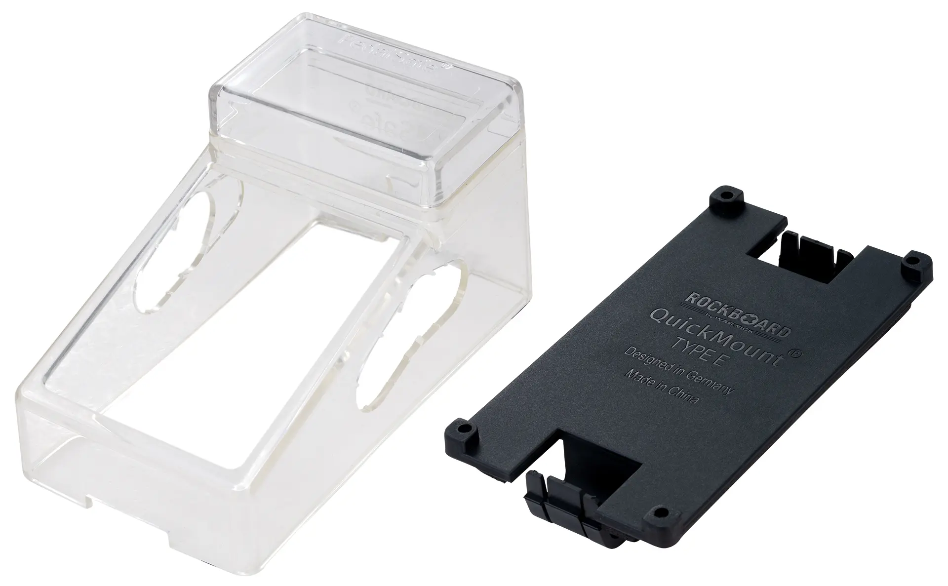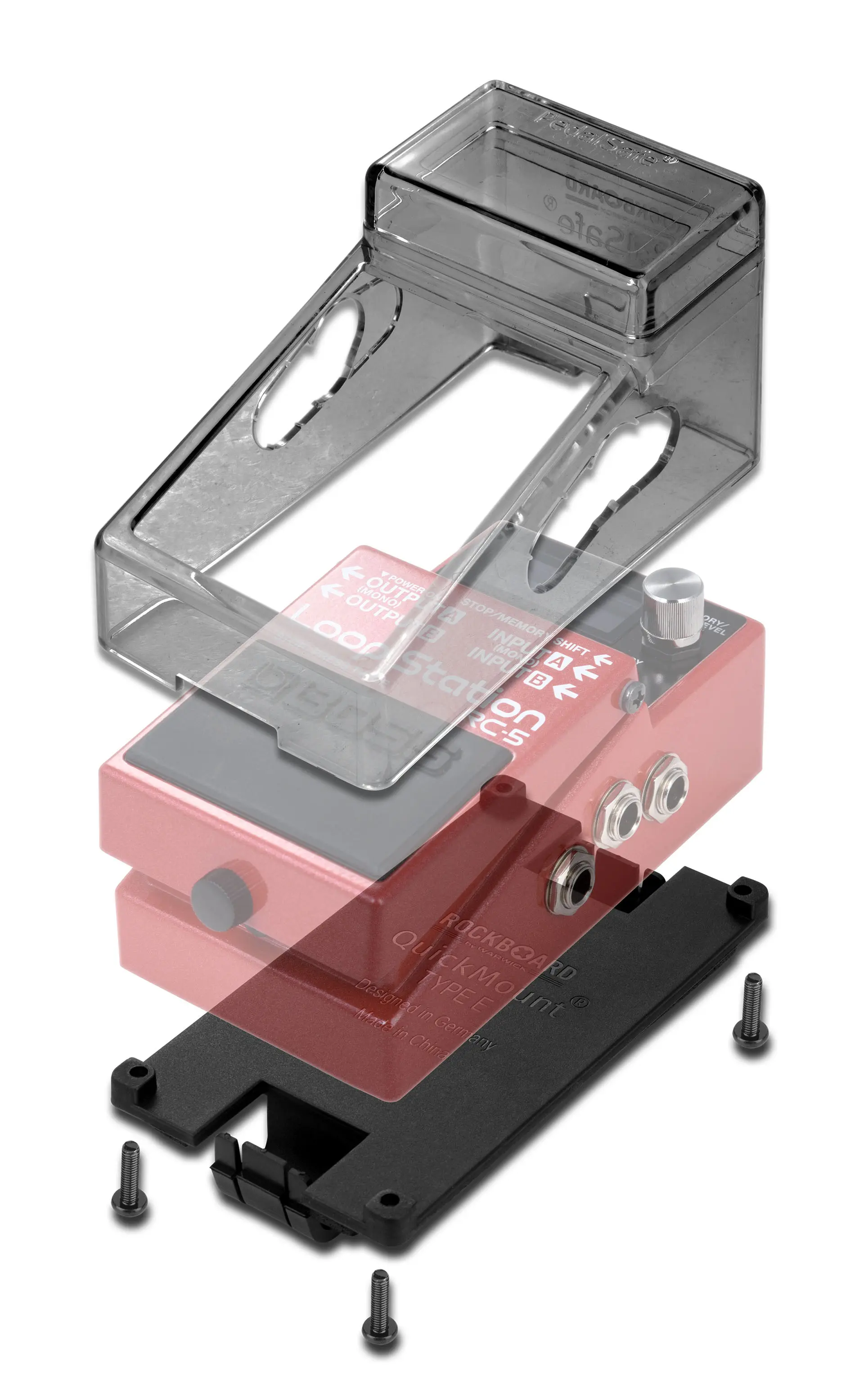 The RockBoard PedalSafe system was designed to keep your pedals safe, secure and in pristine condition. The flexible PedalSafe Type E1 Protective Cover and the QuickMount Pedal Mounting Plate fit for Boss Compact Series, RC3 LoopStation & RC5 LoopStation pedals. The crystal-clear pedal cover allows you to see your settings while the shell is protecting them against accidental adjustments. This set includes the protective cover (PedalSafe) and the RockBoard mounting plate (QuickMount). The RockBoard QuickMount system was designed to do away with sticky hook and loop tape that attracts dust and dirt and is a hassle to remove from your pedals. It fits perfectly in the RockBoard slot grid on our pedalboards and allows for instant secure mounting of your pedals. The QuickMount plates are designed to screw onto the back of your pedals, using the original screws (or supplied replacement screws) and to be easily removable without any residue.