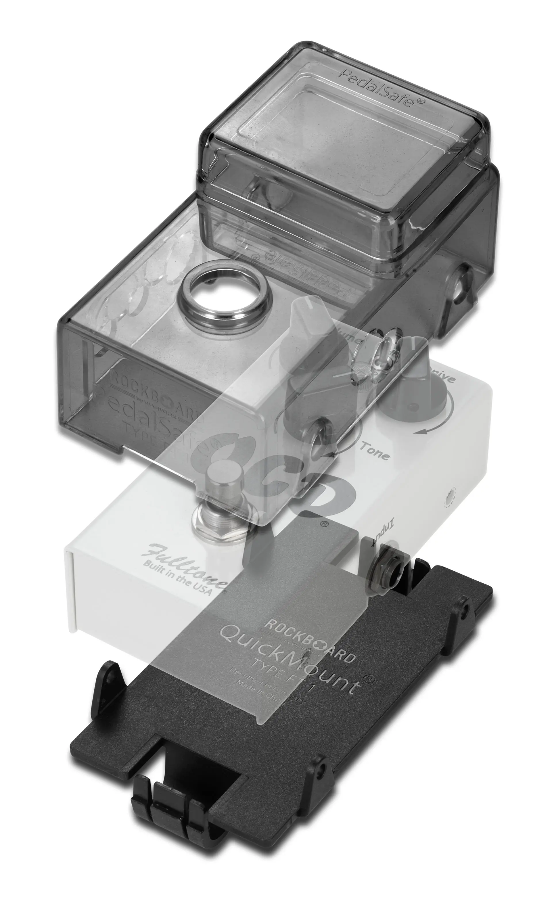 The RockBoard PedalSafe system was designed to keep your pedals safe, secure and in pristine condition. The flexible PedalSafe Type FT1 Protective Cover and the QuickMount Pedal Mounting Plate fit for FULLTONE OCD & 69 MK2 pedals. The crystal-clear pedal cover allows you to see your settings while the shell is protecting them against accidental adjustments. This set includes the protective cover (PedalSafe) and the RockBoard mounting plate (QuickMount). The RockBoard QuickMount system was designed to do away with sticky hook and loop tape that attracts dust and dirt and is a hassle to remove from your pedals. It fits perfectly in the RockBoard slot grid on our pedalboards and allows for instant secure mounting of your pedals. The QuickMount plates are designed to screw onto the back of your pedals, using the original screws (or supplied replacement screws) and to be easily removable without any residue.
