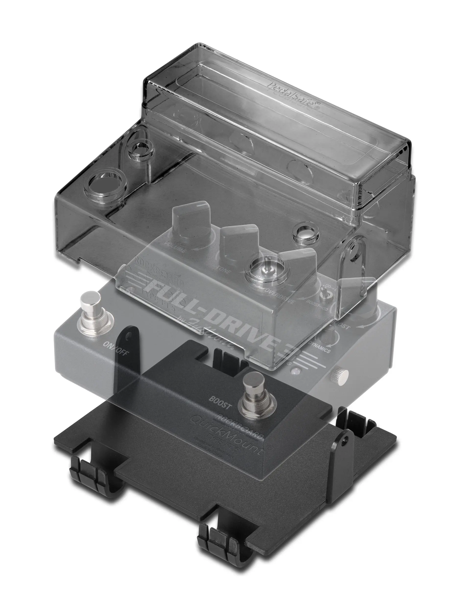 The RockBoard PedalSafe system was designed to keep your pedals safe, secure and in pristine condition. The flexible PedalSafe Type FT5 Protective Cover and the QuickMount Pedal Mounting Plate fit for FULLTONE FullDrive 3 pedals. The crystal-clear pedal cover allows you to see your settings while the shell is protecting them against accidental adjustments. This set includes the protective cover (PedalSafe) and the RockBoard mounting plate (QuickMount). The RockBoard QuickMount system was designed to do away with sticky hook and loop tape that attracts dust and dirt and is a hassle to remove from your pedals. It fits perfectly in the RockBoard slot grid on our pedalboards and allows for instant secure mounting of your pedals. The QuickMount plates are designed to screw onto the back of your pedals, using the original screws (or supplied replacement screws) and to be easily removable without any residue.