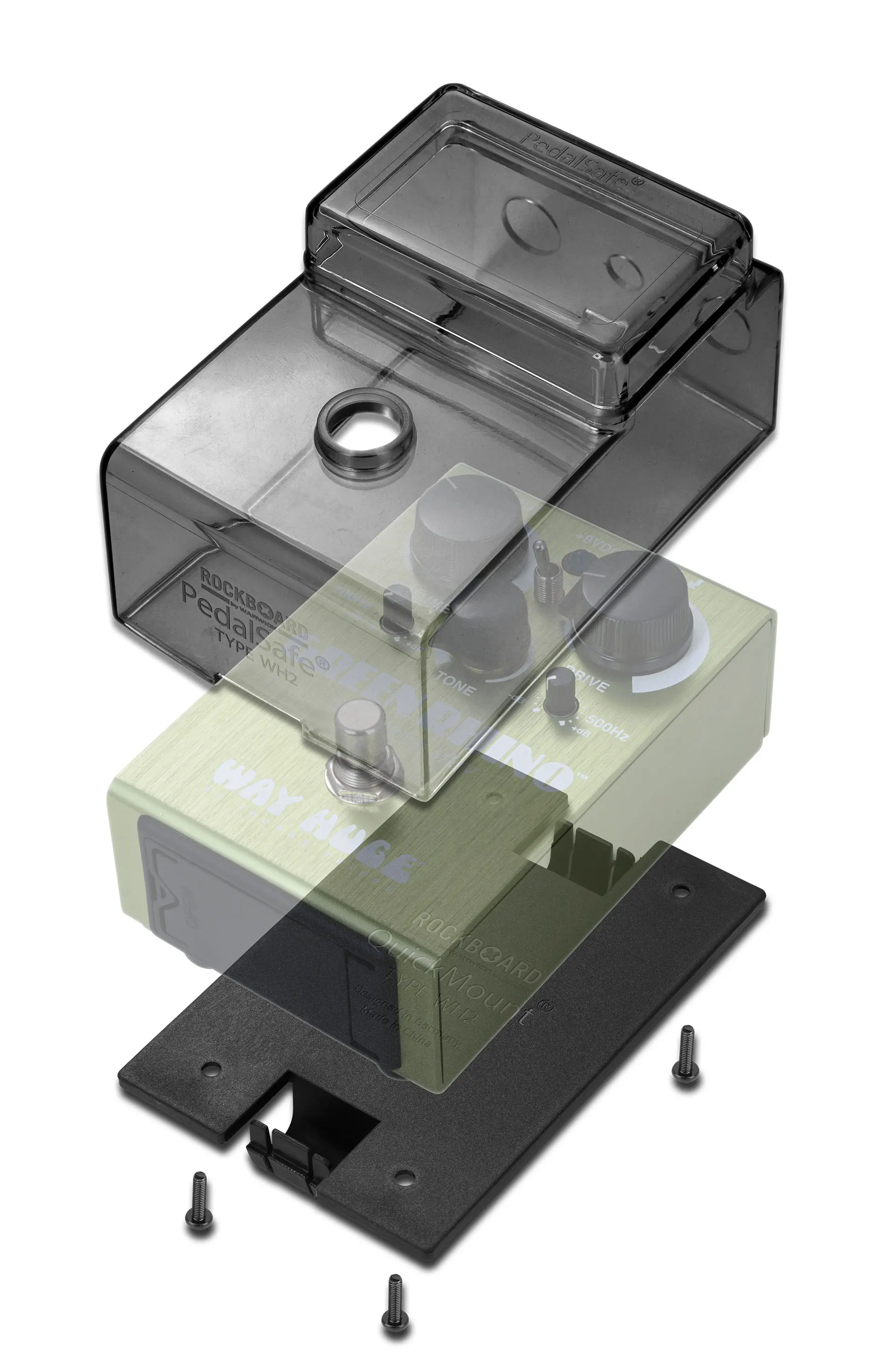 The RockBoard PedalSafe system was designed to keep your pedals safe, secure and in pristine condition. The flexible PedalSafe Type WH2 Protective Cover and the QuickMount Pedal Mounting Plate fit for DUNLOP WAY HUGE GreenRhino & RedLlama pedals. The crystal-clear pedal cover allows you to see your settings while the shell is protecting them against accidental adjustments. This set includes the protective cover (PedalSafe) and the RockBoard mounting plate (QuickMount). The RockBoard QuickMount system was designed to do away with sticky hook and loop tape that attracts dust and dirt and is a hassle to remove from your pedals. It fits perfectly in the RockBoard slot grid on our pedalboards and allows for instant secure mounting of your pedals. The QuickMount plates are designed to screw onto the back of your pedals, using the original screws (or supplied replacement screws) and to be easily removable without any residue.