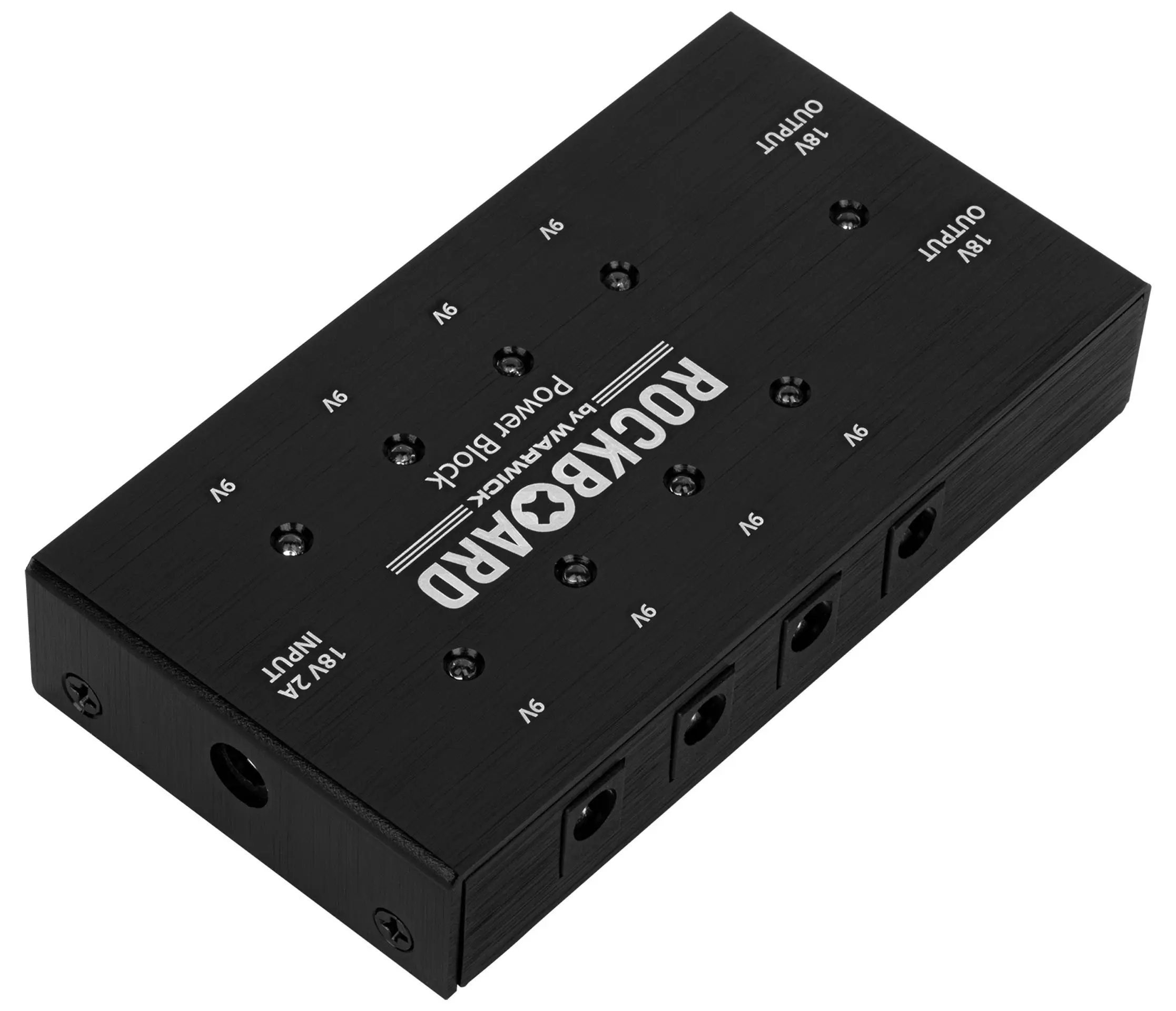 The RockBoard Power Block is a compact multi-power supply for effect pedals that provides 10 power connections to power up to 10 effects pedals in parallel. With a total of 1,200 mA available for the eight 9V slots and a total of 800 mA for the two 18V slots, you can easily power any modern effects pedal setup.