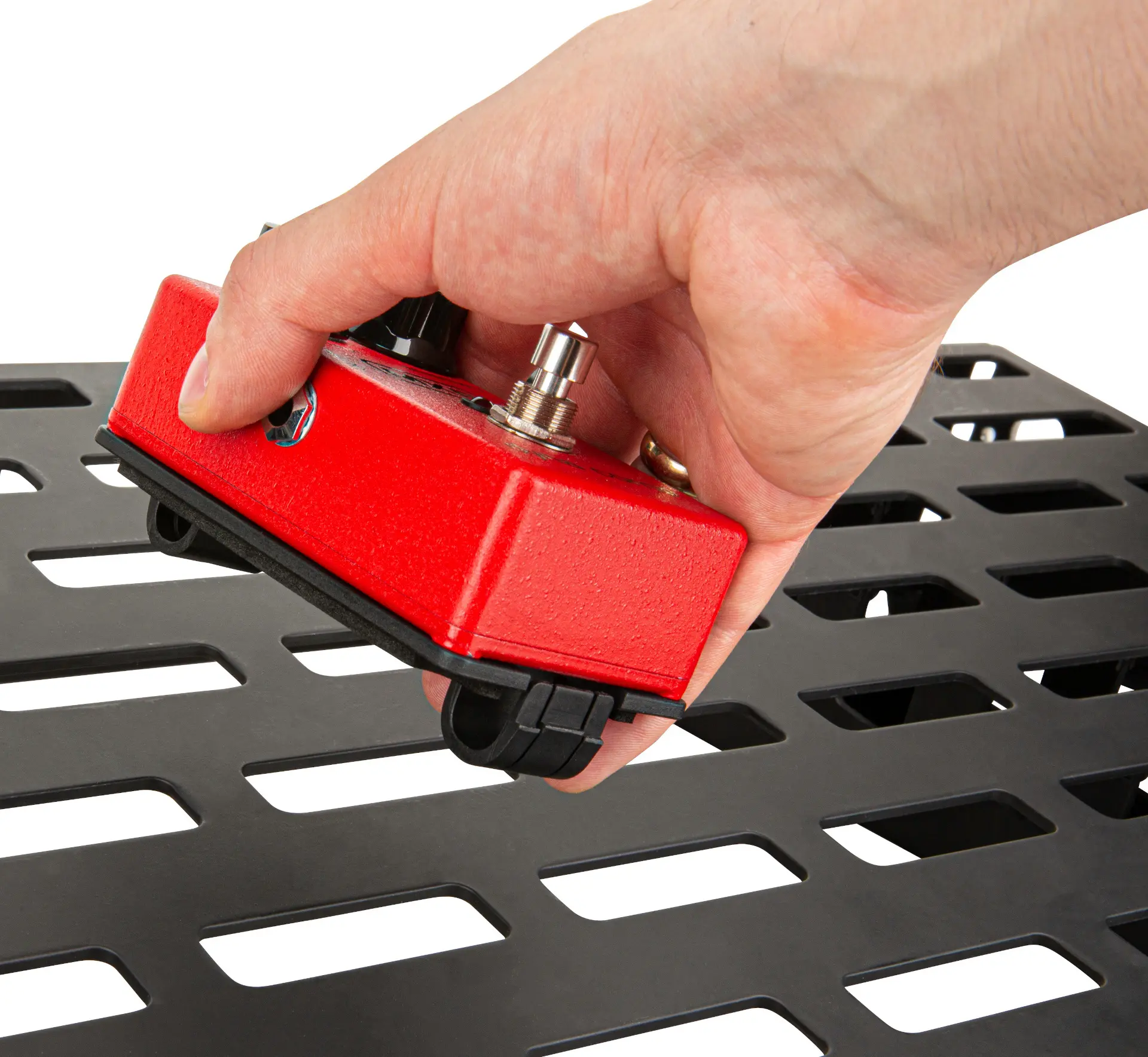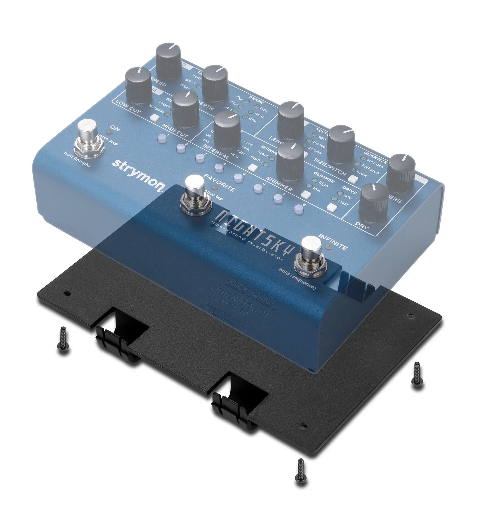 The RockBoard QuickMount System was designed to do away with sticky hook and loop tape that attracts dust and dirt and is a hassle to remove from your pedals. It fits perfectly in the RockBoard Slot Grid on our pedalboards and allows instant secure mounting of your pedals. The QuickMount plates are designed to screw onto the back of your pedals, using the original screws (or supplied replacement screws) and to be easily removable without any residue. Most RockBoard QuickMount Pedal Mounting Plates will fit a variety of different pedals.